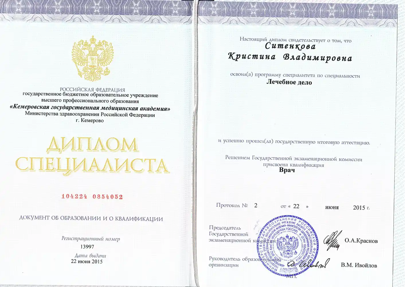 • 2015 — Кемеровская государственная медицинская академия (квалификация по направлению "Лечебное дело": врач);