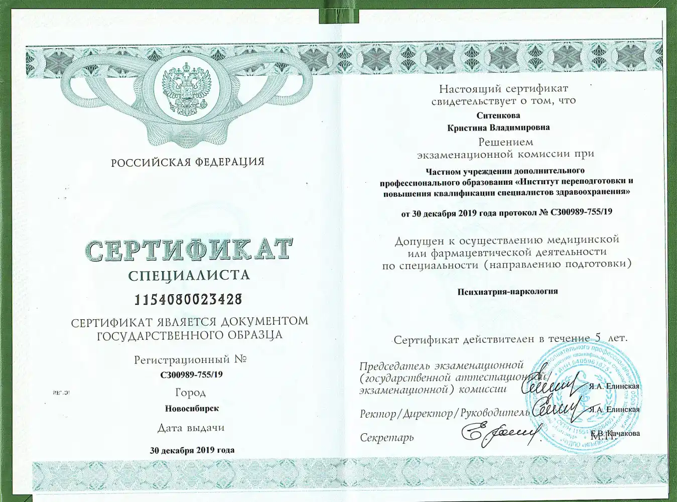 • 2020 — Сибирский институт непрерывного медицинского образования (специальность: Психиатрия).